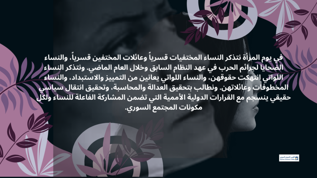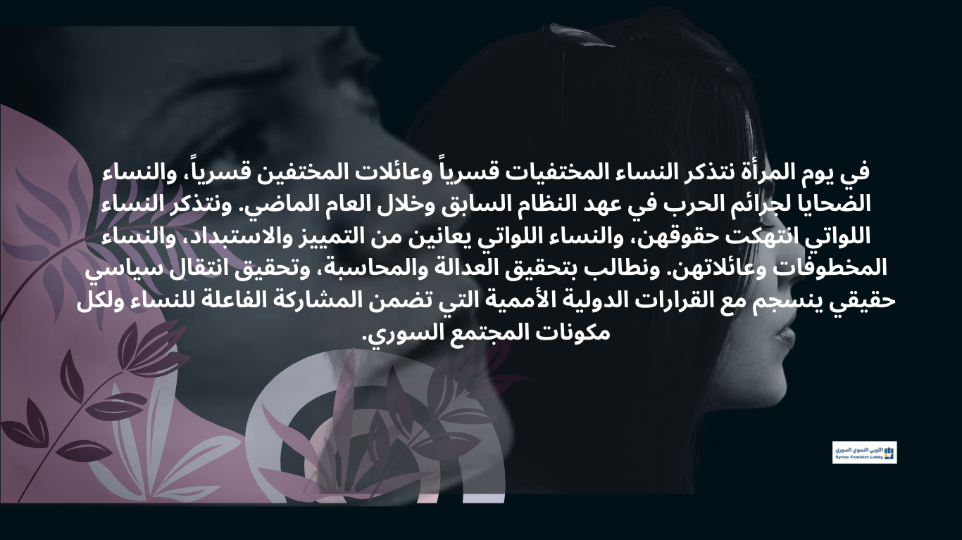 في هذا اليوم نتذكر النساء المختفيات قسريًا وعائلات المختفين قسريًا، والنساء الضحايا لجرائم الحرب في عهد النظام السابق وخلال العام الماضي. ونتذكر النساء اللواتي انتهكت حقوقهن، والنساء اللواتي يعانين من التمييز والاستبداد، والنساء المخطوفات وعائلاتهن. ونطالب بتحقيق العدالة والمحاسبة، وتحقيق انتقال سياسي حقيقي ينسجم مع القرارات الدولية الأممية التي تضمن المشاركة الفاعلة للنساء ولكل مكونات المجتمع السوري.