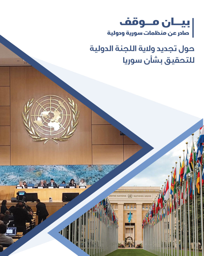 ترحب منظمات المجتمع المدني السوري والمنظمات الدولیة والإقلیمیة الموقعة على ھذا البیان بتجدید ولایة لجنة التحقیق الدولیة المستقلة بشأن سوریا خلال الدورة الحادیة والستین لمجلس حقوق الإنسان. وتؤكد على الأھمیة المستمرة لوظائف اللجنة في تقصي الحقائق وتقاریرھا العلنیة، وجھودھا الرامیة إلى دعم المساءلة، والتي لا تزال بالغة الأھمیة، وتدعو إلى تقدیم دعم مستدام لضمان التنفیذ الفعّال لولایتھا.