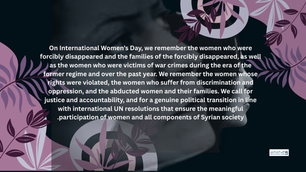 On International Women’s Day, we remember the struggles of Syrian women for freedom, dignity, equality, and democracy. We affirm that achieving a national state requires equal citizenship for all Syrians, women and men. The Syrian Feminist Lobby emphasizes that Syria needs to achieve transitional justice that ensures justice for all victims without discrimination and holds accountable all those who committed crimes against Syrians, women and men, before and after the fall of the Assad regime.